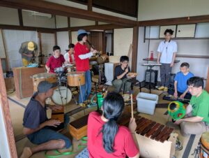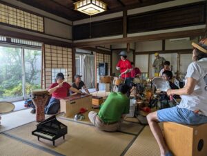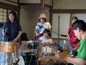 大きなマレットで打つ大太鼓のエネルギーはやはりすごく、みんなの感情をかき立てている。永井くんのドラムセットのバスドラムも力強く、オレについてこいという煽動力がある。そのうちちかちゃんやゆりちゃんが近くにあった木琴も叩いており、途中から太鼓だけはなくなっていたが、いつしかそれまで比較的自分を押し殺していた学生さんが永井くんとドラムバトルをはじめていた。