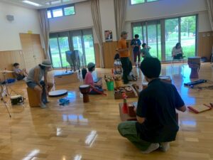 ⑧おりと(小物)、翼(太鼓)、山本さん(ミニ太鼓)、ゆりさん(鉄筋)・・・ 翼くんがジェンベを叩いたりやめたり。その様子を観察しながら他がそれぞれの音を出す。時々、若干の緊張感がプラスされる即興。