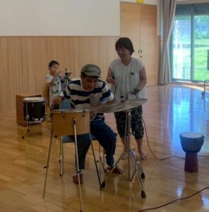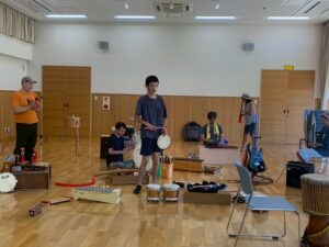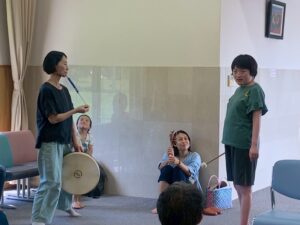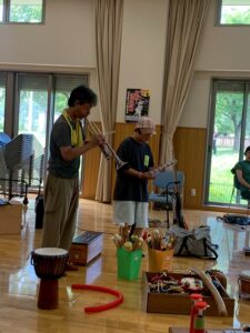 ⑦ ゆい(スライドホイッスル)、りさ(フレームドラム)、ともす(歩く・走る)・・・りさちゃんへのインタビューのような時間、りさちゃんの視線の行方に注目すると面白かった。