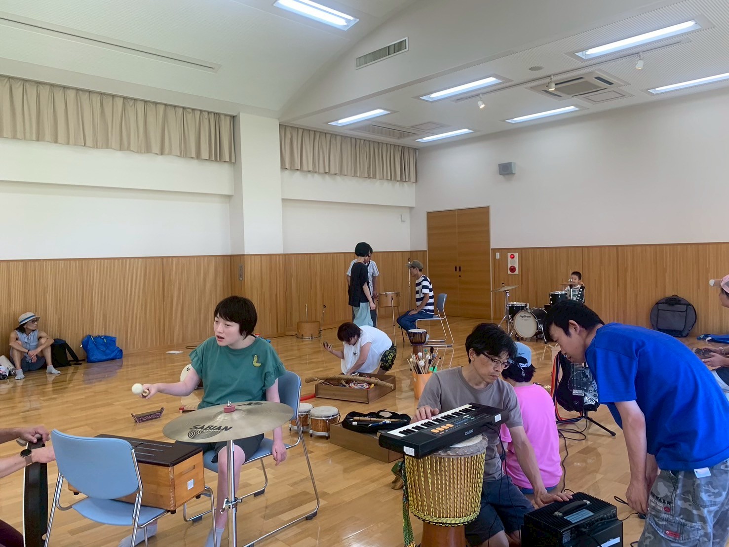 後半の後半、電子キーボードから流れるアップテンポなリズムパターンが、それまでまったりとしていた空気感に変化をもたらせました。電子音と並行して独走して遊び出すタムやシンバルや声が響き始めました。 音一つで、一気に即興の流れが変わることは即興演奏の面白さの一つであるのですが、音遊びの会の演奏でもよく起こるシチュエーション。それがメンバーの仕草や独り言だったりもします。その独り言が絶妙に面白い! ディズニーランド愛が溢れる語り(ラップ)。鼻歌。ジャーゴン(宇宙語?)の応答など、楽器だけでなく面白い声もたくさん聴けました。